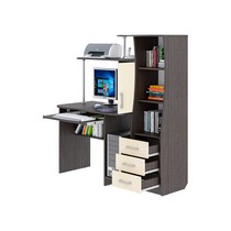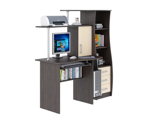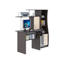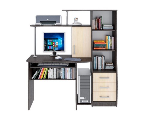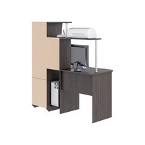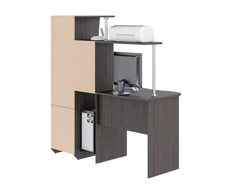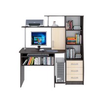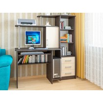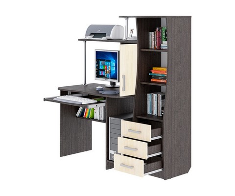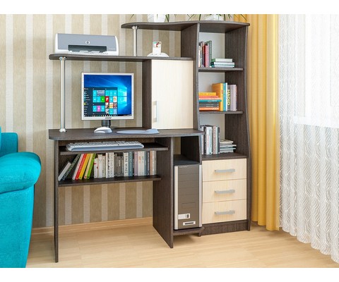 Вместительный и эргономичный компьютерный стол СК-28 оснащён: прямая столешница, полка для клавиатуры, полка под системный блок, две ниши, декорированные хромированными трубами, распашной шкафчик с двумя ящиками, стационарный пенал с тремя ящиками полного выдвижения (роликовые направляющие) и тремя открытыми нишами.