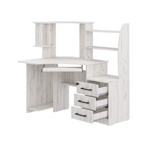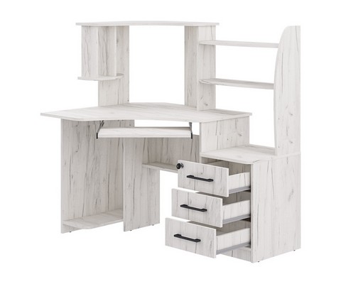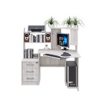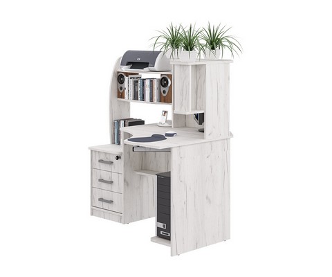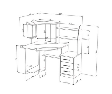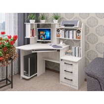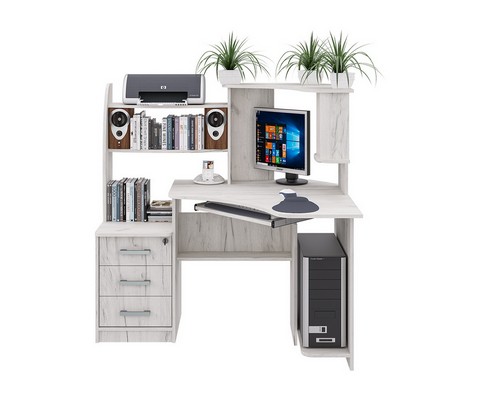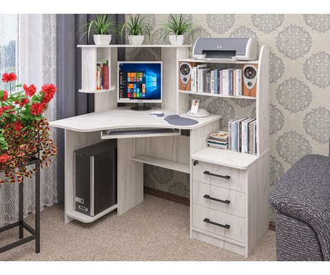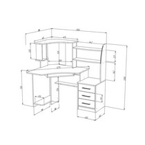 Снабжен: фигурная столешница с местом под монитор 520х470мм, ниша под системный блок и полка для клавиатуры, две вместительные и три небольшие полки, с дополнительной нишей под принтер. Края стола сглажены для комфортного пользования, регулируемые опоры компенсируют возможные неровности пола.
