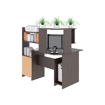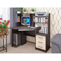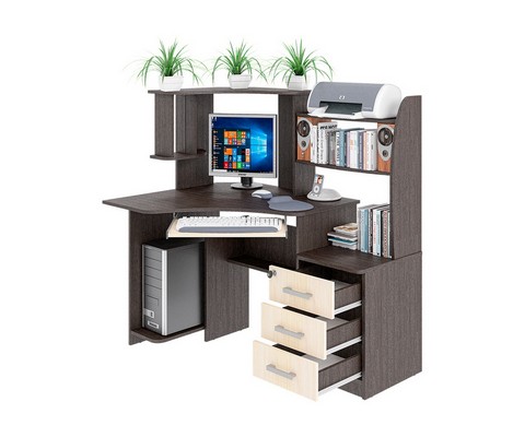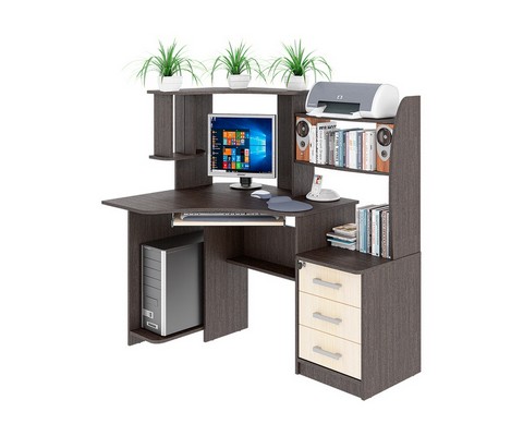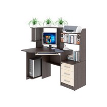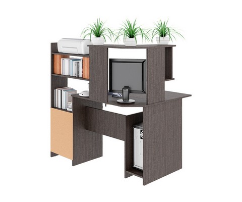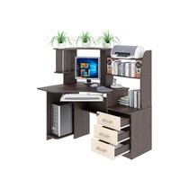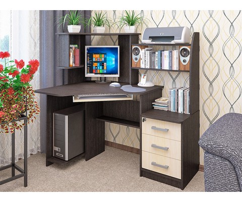 Снабжен: фигурная столешница с местом под монитор 520х470мм, ниша под системный блок и полка для клавиатуры, две вместительные и три небольшие полки, с дополнительной нишей под принтер. Края стола сглажены для комфортного пользования, регулируемые опоры компенсируют возможные неровности пола.