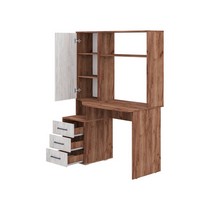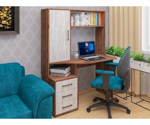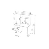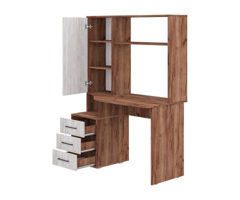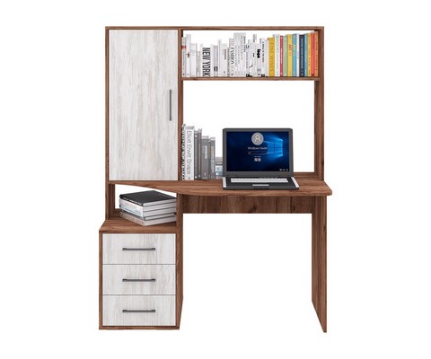 Верхняя часть стола представляет собой надстройку, в верхней части которой расположена открытая полка для книг, слева имеется закрытый шкаф с распашной дверцей и тремя вместительными нишами внутри.