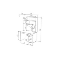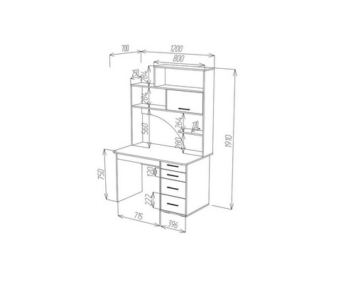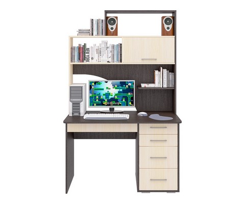 Конструкция оснащена: прямая столешница, четыре вместительных ящика полного выдвижения (шариковые направляющие) разных по высоте, пять полок. Края стола сглажены для комфортного пользования, регулируемые опоры компенсируют возможные неровности пола.