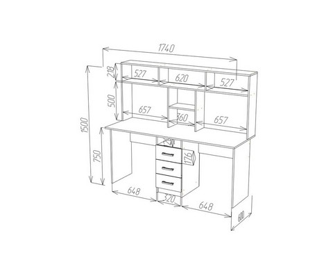 Данная модель оснащена: большой рабочей площадью, столешница прямая, разделительная тумба с четырьмя ящиками полного выдвижения (шариковые направляющие) и шесть вместительных ниш, верхняя часть надстройки образует дополнительную полку.