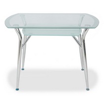 Ножки выполнены из хромированного металла, столешница из стекла с матовой окантовкой.