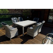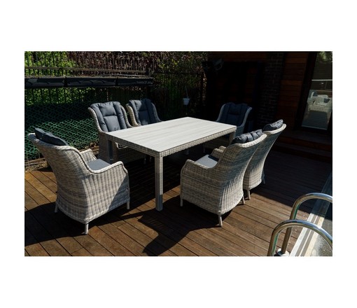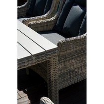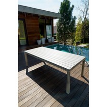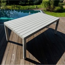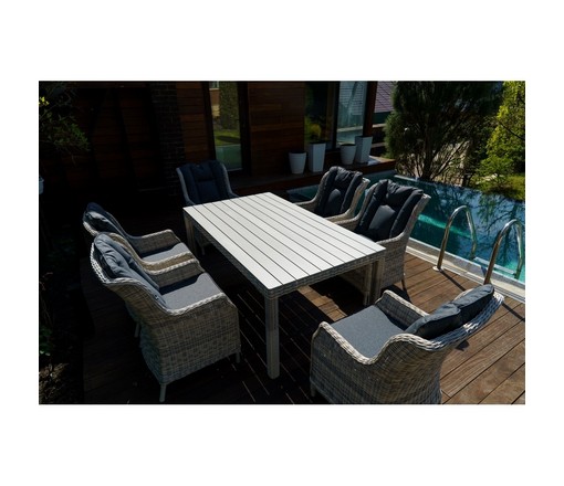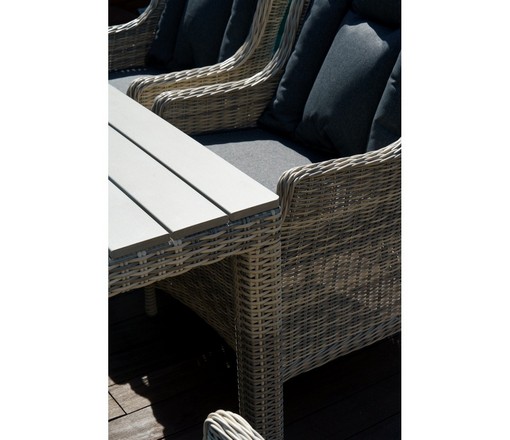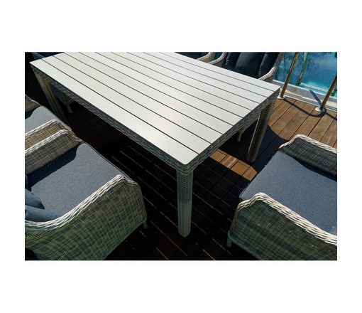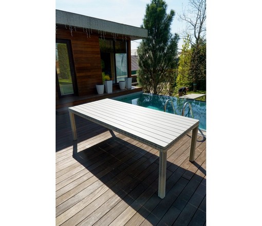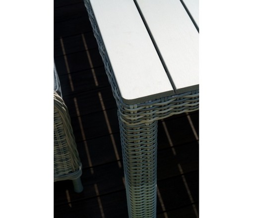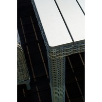Прямоугольная столешница из поливуда с оплеткой из искусственного ротанга.