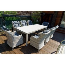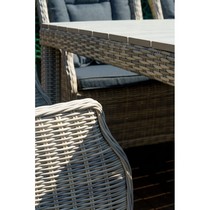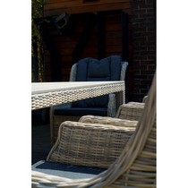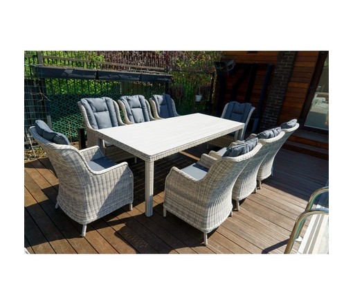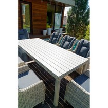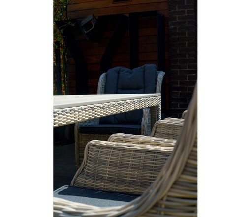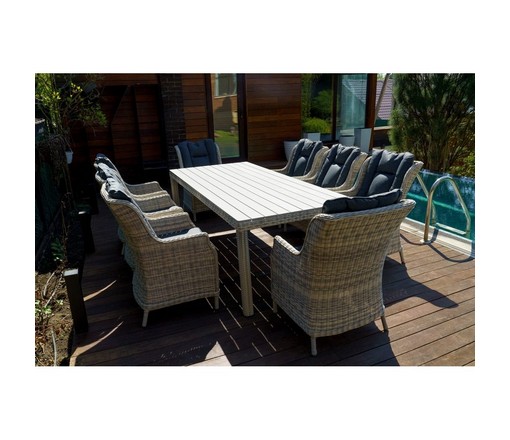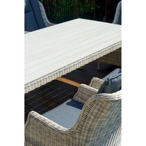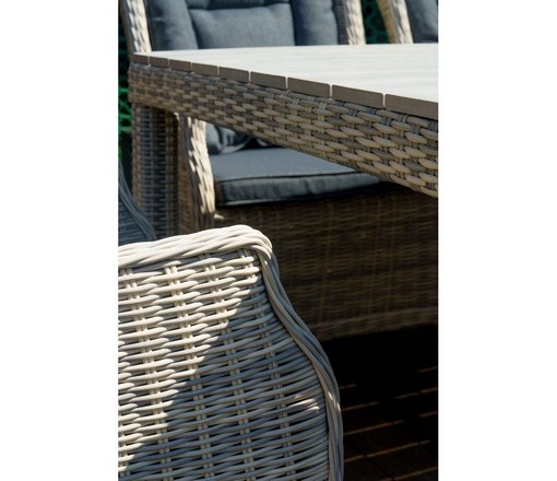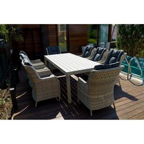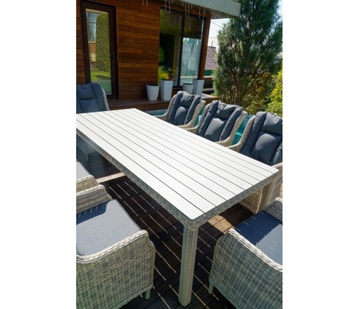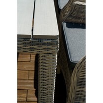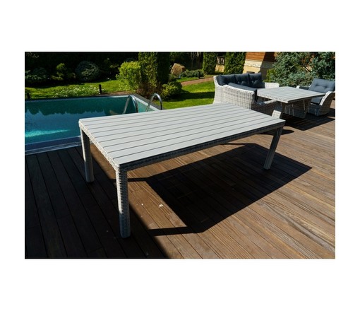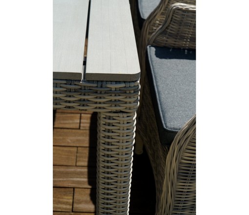 Прямоугольная столешница из поливуда с оплеткой из искусственного ротанга.