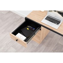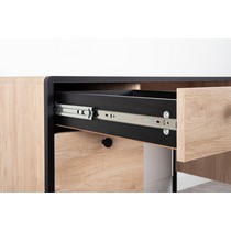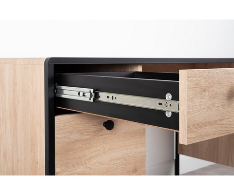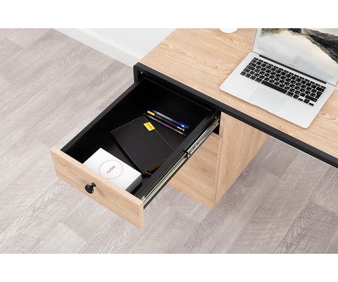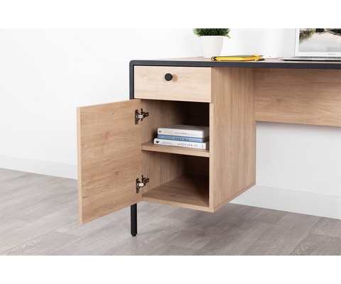 Стол имеет регулируемые опоры, ящик с направляющими полного выдвижения и полку с распашной дверцей.