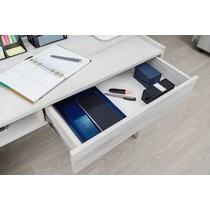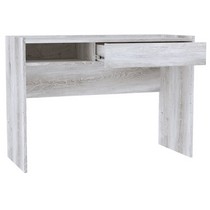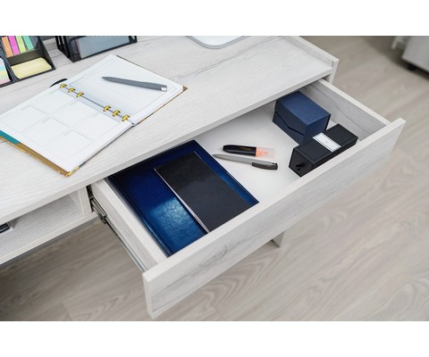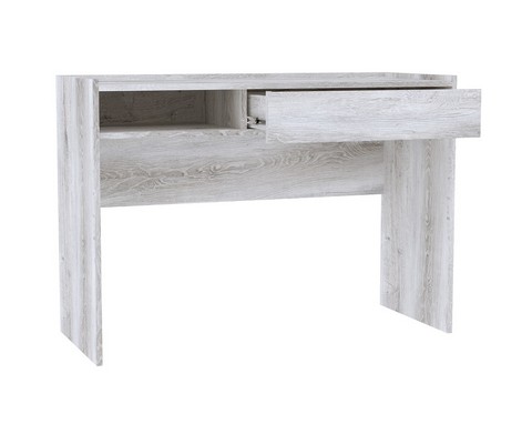 У стола под столешницей расположены открытая ниша и выдвижной ящик открывающийся за свес фасада.