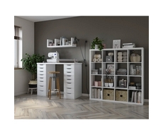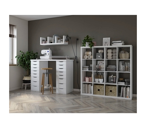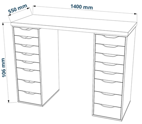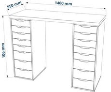 Комплектуется столешницей и двумя высокими тумбами под столешницу с пятью выдвижными ящиками в каждой тумбе.