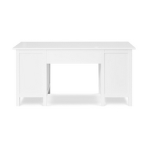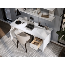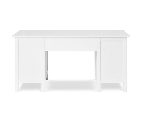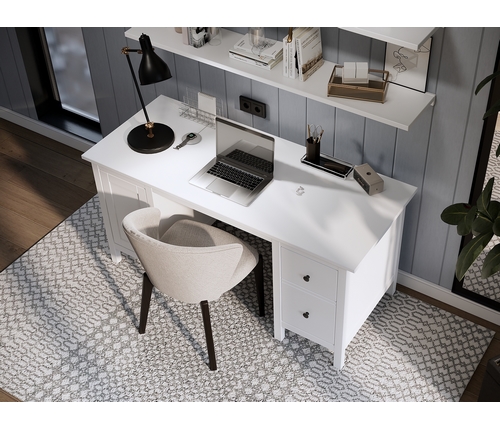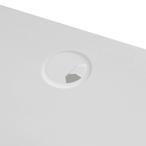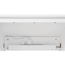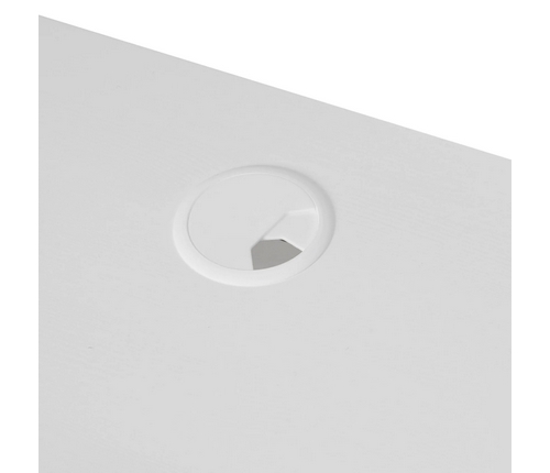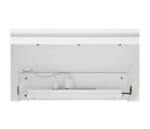 Продуманная система кабель-менеджмента включает в себя полку для удлинителя под столешницей и отверстия для кабелей в столешнице и тумбах.