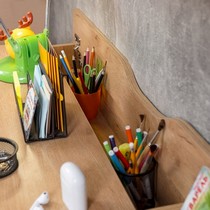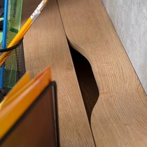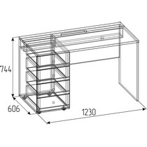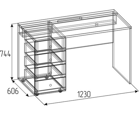 Стол оснащен тумбой с четырьмя выдвижными ящиками, откидной частью на столешнице, которая открывается за плавный вырез.