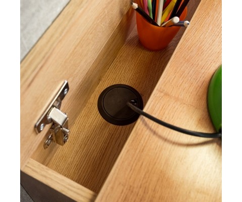 За откидной крышкой находится ниша для хранения и отверстие с заглушкой для вывода проводов.