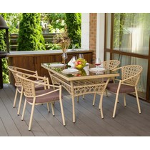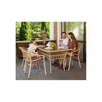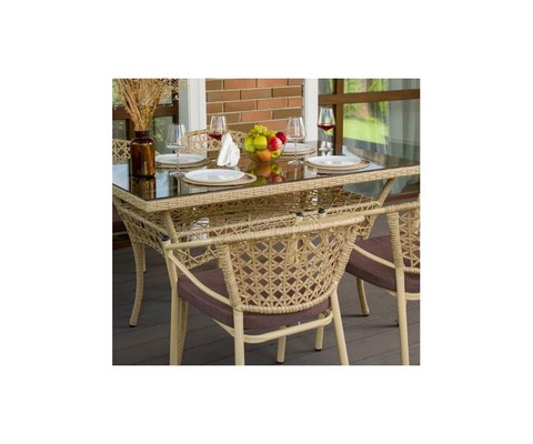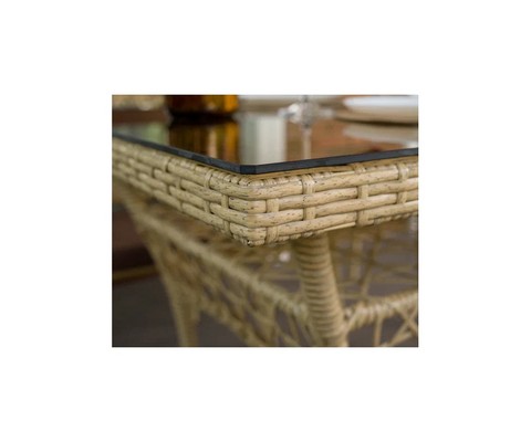 Искусное плетение из искусственного ротанга придает столу привлекательный внешний вид.