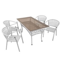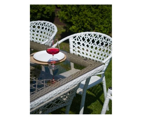 Искусное плетение из искусственного ротанга создает привлекательный визуальный эффект и добавляет столу легкости и элегантности.