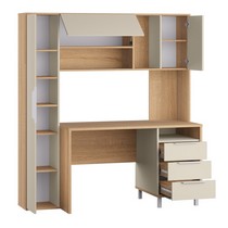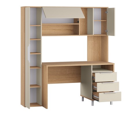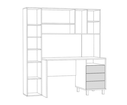 Стол состоит из трех ящиков, надстройки с закрытыми и открытыми отделениями и пенала с пятью полками.