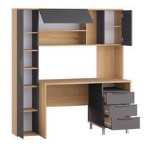 Стол состоит из трех ящиков, надстройки с закрытыми и открытыми отделениями и пенала с пятью полками.