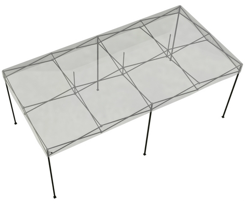 Материалы: крыша - прорезиненный полиэстер Oxford PVC 1080D устойчивый к выгоранию с водоотталкивающим покрытием и проклеенными швами, стенки - полиэстер Oxford 210D, каркас - сталь 1,0 мм (внешняя стойка 40x40 мм, внутренняя стойка 35x35 мм, перекрёстные планки 15x30 мм).
