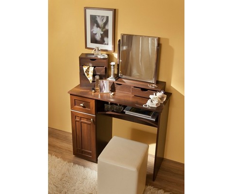 Туалетный стол оснащен тумбой, выдвижным ящиком и нишей под столешницей.