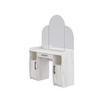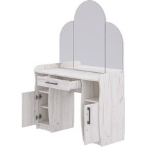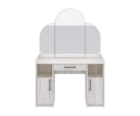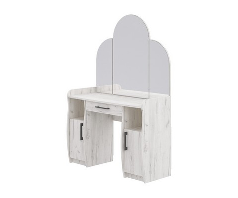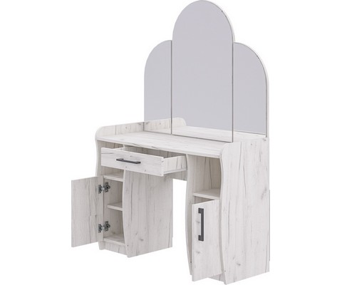 В центральной части расположен ящик с полным выдвижением, по обеим сторонам трюмо имеется открытая ниша и вместительная тумба с распашной дверцей, в каждой из которой по два отсека.