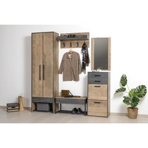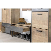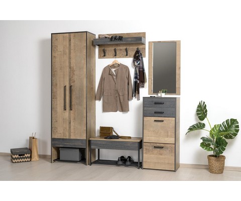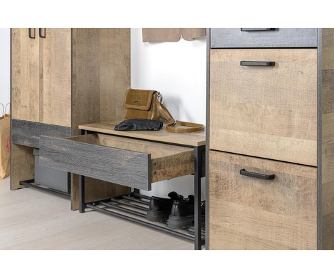 Обувница выполнена в теплом древесном оттенке дуб гранж песочный в сочетании с фасадом в цвете интра и черных металлических опор.