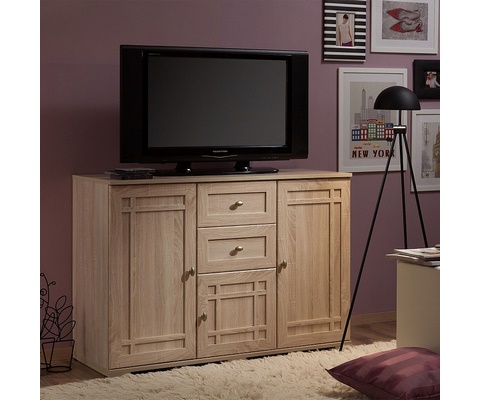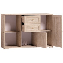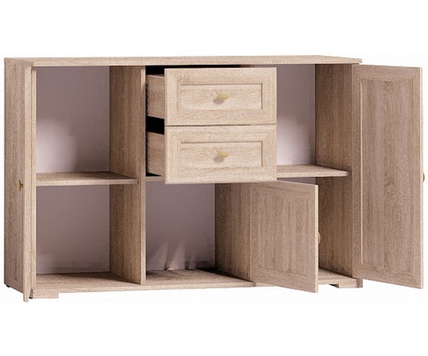 Тумба оснащена 3 отделениями с распашной дверью (2 больших и 1 маленькое) и 2 выдвижными ящиками.