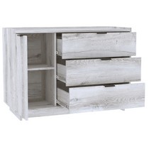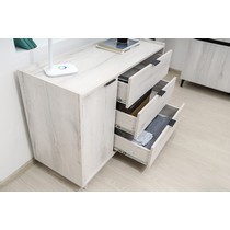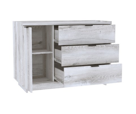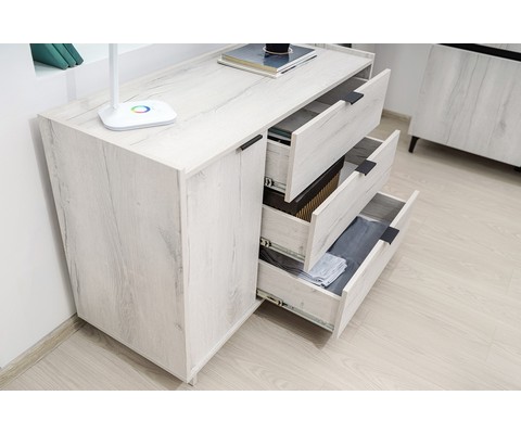Тумба имеет 3 выдвижных ящика и боковое отделение с двумя полками и распашной дверкой.