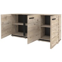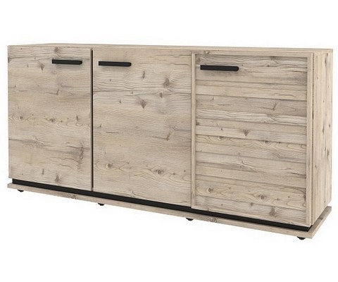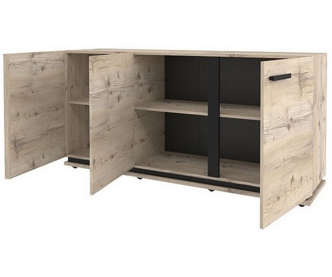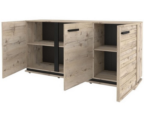 Тумба состоит из трех отделений, за распашными дверцами которых скрываются полки.