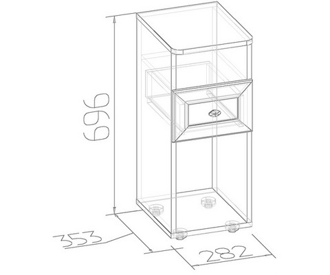 Материалы: ЛДСП (16 мм), профиль МДФ, кромка ПВХ (0,2 мм), задняя стенка и дно ящика ХДФО (3 мм), шариковые направляющие, металлическая ручка.