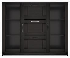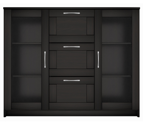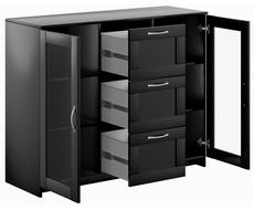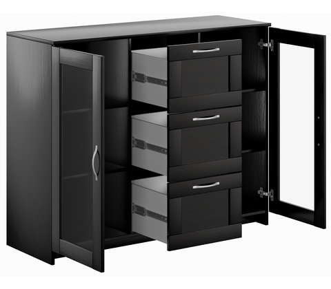 Тумба с двумя стеклянными дверьми и тремя ящиками.