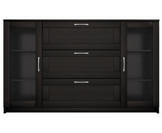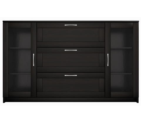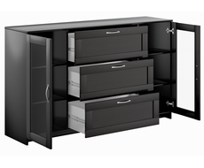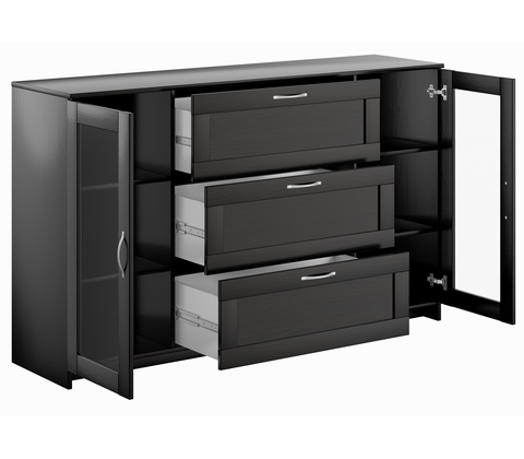 Тумба с двумя стеклянными дверьми и тремя ящиками.