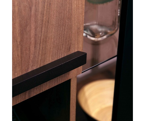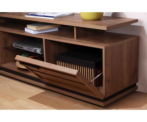 Тумба оснащена двумя закрытыми отделениями с дверями, 1 стеклянной полкой и 5 открытыми нишами.