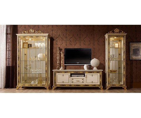 Мебель имеет трехслойное лаковое покрытие, изделия выполнены с применением трехцветной шелкографии. Объёмный декор – мебельный пенополиуретан. Кромка и стяжки - Германия. Петли, ручки - Италия. Боковины изделий – без лака.