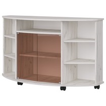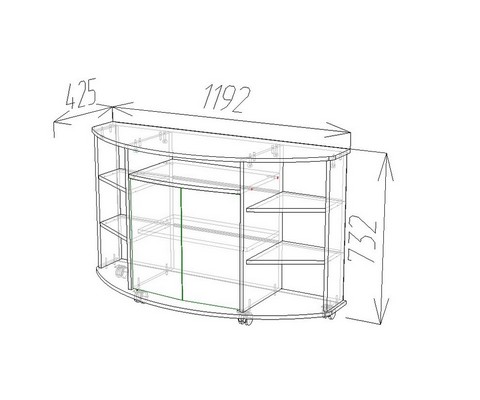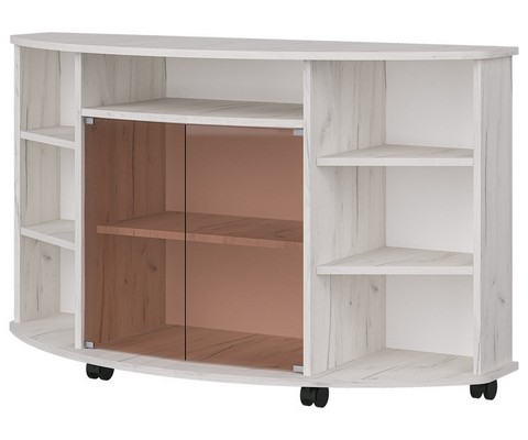 Конструкция оснащена восьмью нишами, застеклённые тонированные дверцы открывают доступ к двум вместительным полкам.