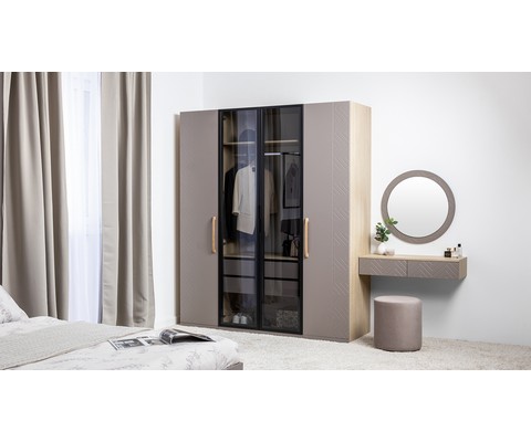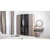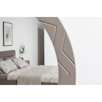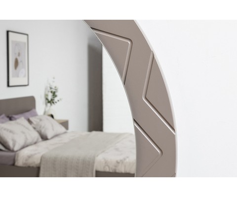 Широкая рама, выполненная из ЛМДФ 16 мм в цвете Веллюто Капучино с матовой поверхностью, и изящная фрезеровка создают визуальную легкость и элегантность.